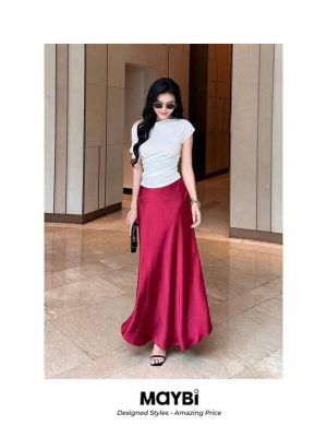 Chân váy chữ A lụa xanh bơ phối nẹp nút chéo